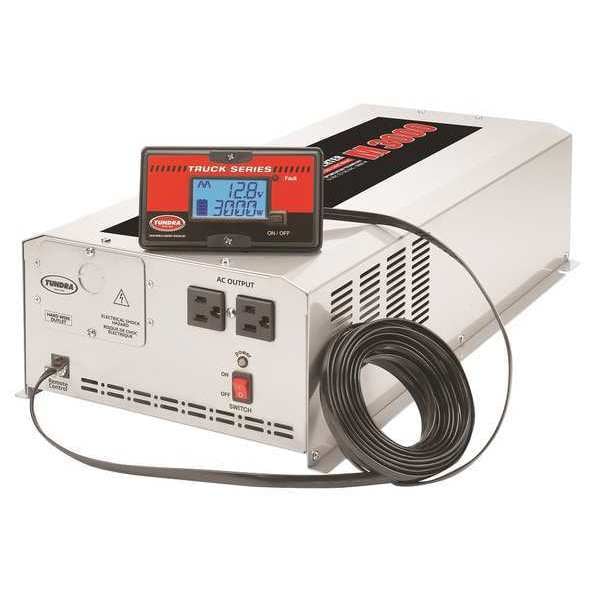 Inverter, Features High Capacity, Ultra-High Output Efficiency and Continuous Output Capacity, Output Form Modified Sine Wave, DC Connection Terminal Blocks, Continuous Output Power 3,000 W, Peak Output Power 6,000 W, Number of Outlets 3, Input Voltage 12V DC, Output Voltage 120V AC, Output Frequency 60 Hz, Efficiency 93 Percent, Overall Depth 24 3/8 in, Overall Height 5 1/8 in, Overall Width 10 3/8 in, Outlet Type (2) NEMA 5-15R, Hardwired, Case Material Steel, Includes LCD Remote Control