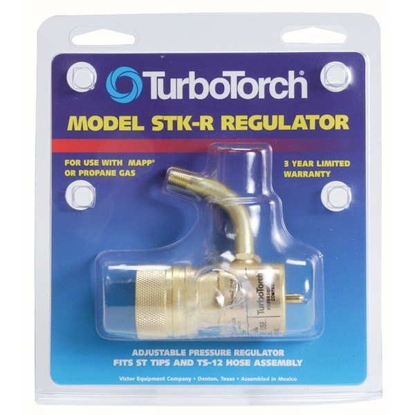 Victor TurboTorch STK-R MAP-Pro/LP Gas Purging Regulator offers 0 - 425 psig delivery range and ideally fits ST tips and TS-12 hose. Adjustable regulator with maximum inlet pressure of 4000 psig features a gauge with 4000 inlet gauge range and 600 outlet gauge range.