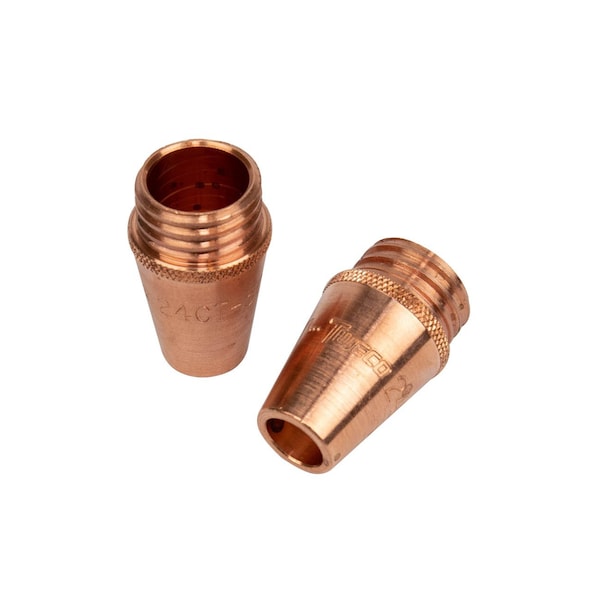 Tweco Coarse Threaded Copper Nozzle with 1/2 bore size is designed for standard gas diffuser and is machined from a solid copper alloy bar to provide consistent dimensional stability as well as efficient heat dissipation. 1.75 Nozzle with 1.07 OD is ideal for use in medium to heavy duty welding application up to 450 A. It features part number rolled stamped on the outer surface for easy identification. It has a 2-piece design and is made of 145 tellurium copper alloy. Nozzle with recess contact tip relationship 0.125 - 0.156 is best suited for higher heat applications requiring longer electrical stick-out or in cases where the nozzle touches the work piece. It is sold as 2 per pack.