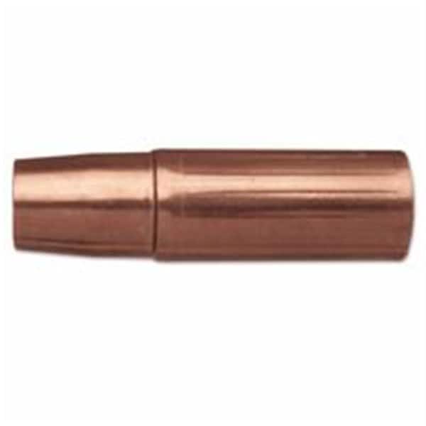 Features Used in medium to heavy duty welding application up to 450 amperes Nozzle Housing - Cut and Formed from copper alloy tubing Nozzle Insert - machined from a solid brass allow and machining the internal threads to match the conductor tube OD threads Nozzle insulator - made from silicone material providing the electrical insulation needed from the gas diffuser Specification Process - GMAW - Air-cooled Bore Size - 0.625 in. Contact Tip Relationship - Recess - 0.125 in. to 0.156 in. Use with Standard Gas Diffuser Part No. 54P Stock No. 1540-1103 Part No. 54A Stock No. 1540-1100 Part No. 54A-16 Stock No. 1540-1104 Tier - WeldSkill Material - Copper Alloy Outside Diameter - 0.875 in. Thread Size - 9/16 in.-18 UNC-2B Overall Length - 3.219 in.