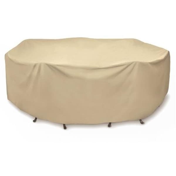 This Two Dogs Designs 108 in. Khaki Round Table Set Cover offers high quality protection for your outdoor patio furniture. Constructed of durable double stitched heavyweight 500*;300D poly-tuf material with 0.50 mm PVC lining. Comes with Cloth Tie ties and an elasticized bottom to secure to chair. Two Dogs covers are cut oversized which allows air to circulate when the cover is secured in place, they have no vents in the fabric to allow in moisture or dirt. Will enhance patios, decks, yards and any other area where you enjoy the outdoors. Coordinates with other Two Dogs Designs outdoor cover.