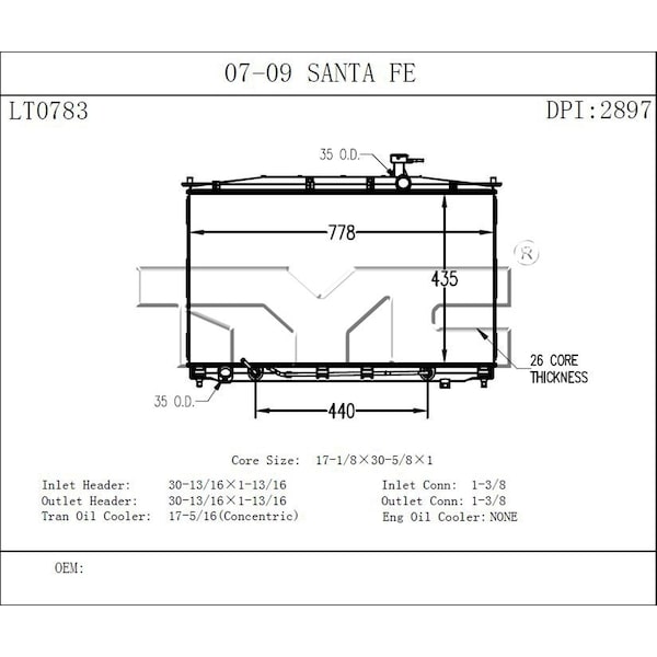 Radiator 2007-2009 Hyundai Santa Fe 2.7L 3.3L, 2897