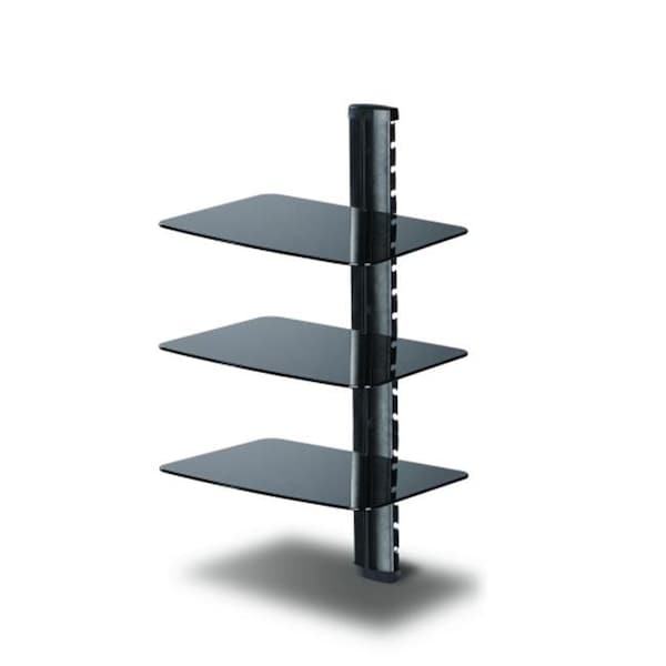 This TygerClaw 3 Layers DVD Stand is a wall mounting shelf with 3 black glasses and each layer allows to hold 22lbs/10kgs of weight, is constructed from aluminum material with adjustable height for total support and durability, also cable managment system is available for user to organize their cables/wires.
