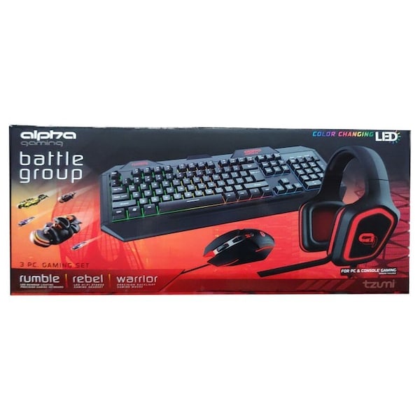 Matched set PC Gaming combo includes illuminated keyboard, illuminated mouse and illuminated headphones with mic w/Dual HD microphones Rebel Hi-Fi Stereo Headset has two 3.5mm plugs one for sound and one for the mic built-in to fit standard PC blue and green inputs. Standard USB connection for Keyboard and Mouse fits virtually all PCs and MACs Warrior Backlit Mouse w/seven buttons Passive noise-canceling technology 6794MYE BLK11.5-in H x 6.3-in W x 23.50-in DWeight: 4.4lbs.Connections: supports USB: 1.0/1.1/2.0Operating system: Windows 2000, Windows XP, Windows 7, Windows 8, Windows 10, Windows 11, Mac operating systemsRecommended: Entry or experienced playing level