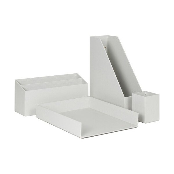 Keep organized in style with the Paper Wrapped Desk Organization collection. Papers and files can be neatly stored in the paper tray and magazine holder. Storage bin offers a convenient spot for your journal, phone or notebook. Pencil cup keeps any other tools out of the way while staying within reach. Constructed of 3mm chipboard and wrapped in premium-coated paper, all materials are responsibly sourced and FSC certified. Sturdy yet lightweight set includes a coordinating pencil cup, paper tray, magazine holder and storage bin.