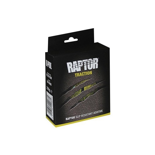 RAPTOR TRACTION slip resistant additive can be added directly into RAPTOR Tough and Tintable Protective Coating bottles prior to spraying. RAPTOR TRACTION is packaged in a convenient 200g resealable bag and will fill one bottle of RAPTOR for a typical sli Use with all RAPTOR Bed Liner and Protective Coating Products The use of RAPTOR TRACTION with RAPTOR produces a slip resistant surface as defined by BS 7976-2.