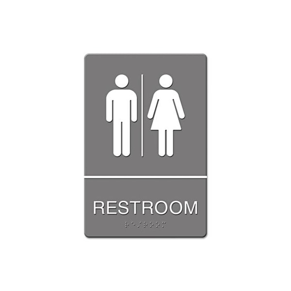 Universally and easily recognizable white graphics. Raised tactile graphics with grade 2 braille. Meets Americans with Disabilities Act ADA requirements. Includes double-side adhesive tape for mounting to door or wall. Frame Color: Gray; Size: 6 x 9; Messages: Restroom Man/Woman; Materials: Molded Plastic.