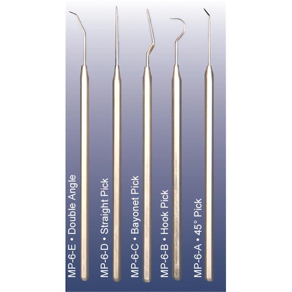 Features These picks are ideal for soldering glueing positioning adjusting and retrieving small parts The needle tips are made of a high quality stainless steel and the set comes packaged in a zippered top vinyl pouch 5 Piece Specifications Length: 5 9/16