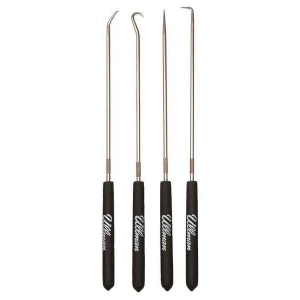 Hook/Pick Set, Handle Material Plastic, Handle Style Knurled, Number of Pieces 4, Overall Length 9 3/4 in, Tip Material Steel, Tip Style 90 Degrees Angle, 45 Degrees Angle, Hook, Straight, Tip Thickness Not Applicable, Product Type Hook/Pick Set, Package Quantity 4