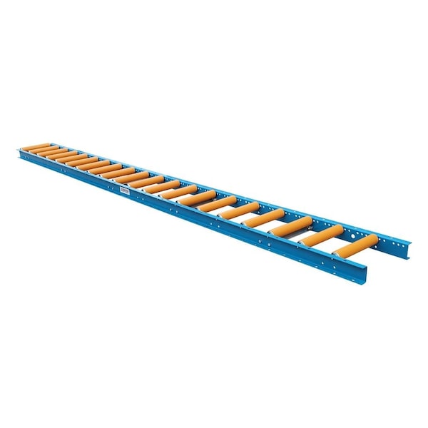 These gravity roller conveyors include the conveyor frames and rollers. Legs if required are sold separately. These conveyors are excellent for both permanent and temporary conveyor lines often found in warehouses, shipping departments and assembly areas. Gravity curves and spur options can add to the versatility of straight conveyors. Use these sections of 10 long conveyors to provide rolling support surfaces either individually or in pairs side by side. The rollers sit approximately 1/4in higher than the frame, allowing the load to protrude over the sides or ends as required. This gravity conveyor is engineered with a 12in overall width from outside of the frame to the outside of the opposite frame, 10in between frame width the distance inside the frames from one side to the other, and 10' overall length. Equipped with a 12 Ga. steel frame measuring 2-1/2in deep x 1in flange, powder-coated in Ultimation Blue, and 1.5in diameter rollers with polyurethane covers measuring 0.062in thick on 6in roller centers. This conveyor has a maximum load capacity of 1,800-pounds when the frame is fully supported.