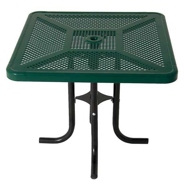 Patio Table, Frame Color Black, Frame Material Steel, Includes Umbrella Hole Yes, Overall Diameter Not Applicable, Overall Height 30 1/4 in, Overall Length 36 in, Overall Width 36 in, Tabletop Color Green, Tabletop Structural Material Steel, Frame Finish Powder Coated, Resistance Properties UV Resistant, Shape Square, Umbrella Hole Diameter 1 9/16 in, Tabletop Construction Perforated, Tabletop Texture Dot, Assembly Unassembled, Features Perforated Metal Tabletop, Product Type Patio Table