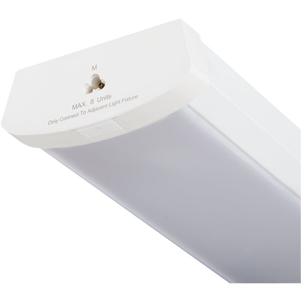 Utility LED (light emitting diode) wraparound ceiling light fixture. Features a convenient linkable design. Up to 8 units can be connected to provide a large amount of reliable illumination. Durable metal housing construction with a long lasting acrylic lens. 4000-kelvin color temperature. ETL listed. 50000-hour lifespan.