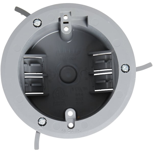 Ceiling electrical box for use in old work applications. Features flanged configuration with adjustable tabs for mounting into existing structures. Equipped with living hinges for additional cable support. Polycarbonate construction for additional durability will not rust or corrode. Includes mounting ears and two swing clamps for easy installation. Not intended for fixture or support in ceilings houses an installed ceiling switch or receptacle. ETL approved.