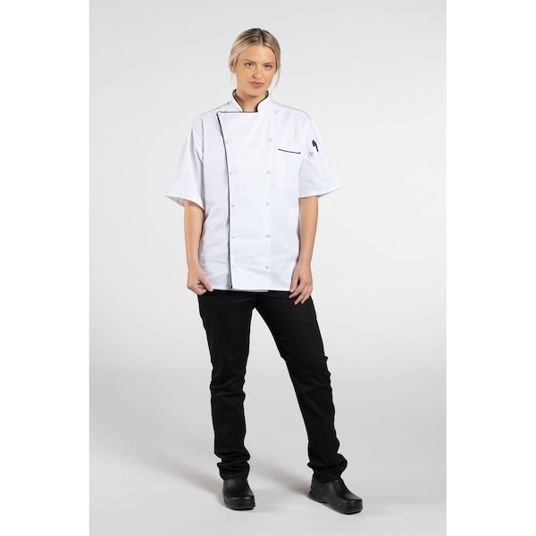 This short sleeve chef coat gives you an executive look at an incredible value. Features a three-piece back, inset pocket, hidden neck button and twelve cloth-covered buttons. Black piping on the collar, facing and pocket gives this coat an elegant finish.