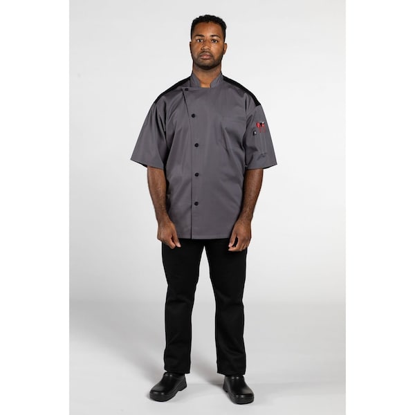 It’s time to break out of the mold and go rogue. This short-sleeved coat with black mesh, black cloth-covered buttons, and an asymmetrical front gives you a dynamic two-toned look while keeping you fresh all day.