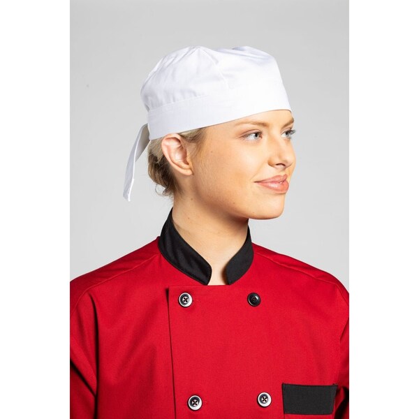 A hip alternative to the conventional chef hat, with elastic back and ties for a more comfortable fit.
