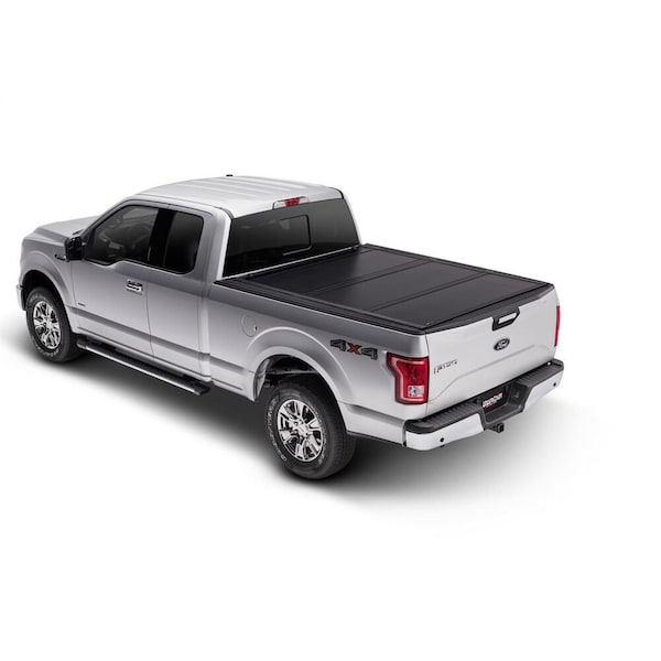 Hard Folding, Low Profile, 2 Folds/ 3 Panels, Front Hinge Allows Entire Tonneau to Flip Up When Folded, Black Matte, Aluminum, Non-Lockable, Bed Rail Compatible/ Bed Cap Compatible