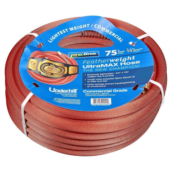 Our Featherweight is a hose like no other. This is the lightest weight commercial quality hose that exists. It boasts pressure ratings up to 800 psi, it has full flow brass fittings that don't restrict water, and it will not kink. We've taken fire industry technology and brought it to everyone. The Proline version is made for everyone from homeowners to contractors. You get all the technology, durability and features of our professional version, but made to suit lower pressure situations.