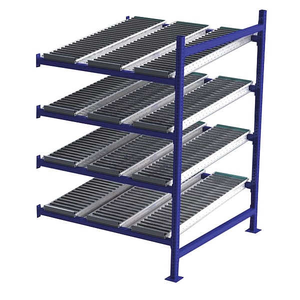 Gravity Flow Rack, 1,000 lb Load Capacity per Shelf, Tilted Shelf Angle, 14 ga Shelf Gauge, Add-On Shelving Configuration, Number of Shelves 4, Decking Finish Powder Coated, Decking Material Steel, Roller Track Decking Style, Depth per Side 48 in, Powder Coated, Steel, Blue, Overall Depth 48 in, Overall Height 72 in, Overall Width 48 in, 12 ga Post Gauge, 4,000 lb Whole Unit Load Capacity, Assembled Unassembled, Labels, Post Caps, Touch Up Marker, Bolt-Together