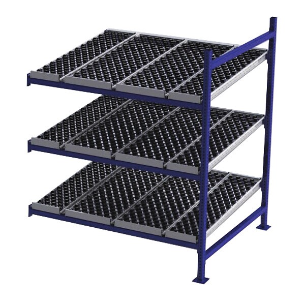 Gravity Flow Rack, 1,000 lb Load Capacity per Shelf, Tilted Shelf Angle, 14 ga Shelf Gauge, Add-On Shelving Configuration, Number of Shelves 3, Decking Finish Powder Coated, Decking Material Rubber, Skate Wheel Track Decking Style, Depth per Side 48 in, Powder Coated, Steel, Blue, Overall Depth 48 in, Overall Height 72 in, Overall Width 60 in, 12 ga Post Gauge, 3,000 lb Whole Unit Load Capacity, Assembled Unassembled, Labels, Post Caps, Touch Up Marker, Bolt-Together