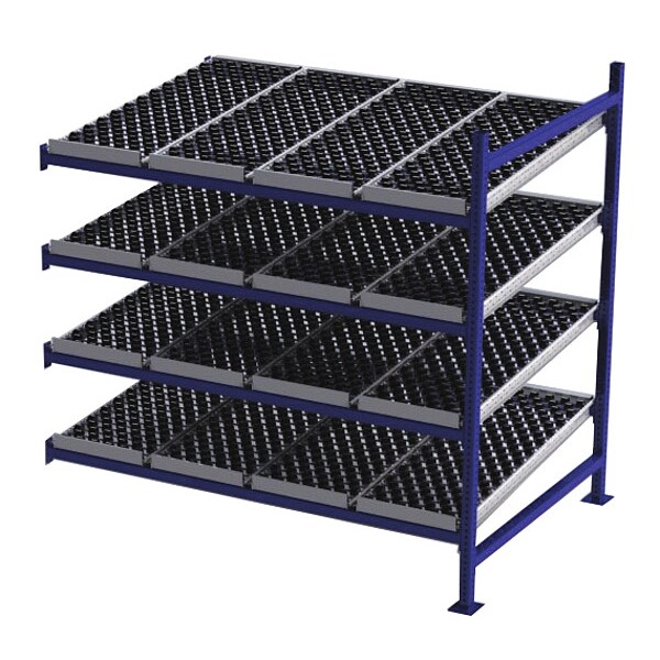 Gravity Flow Rack, 1,000 lb Load Capacity per Shelf, Tilted Shelf Angle, 14 ga Shelf Gauge, Add-On Shelving Configuration, Number of Shelves 4, Decking Finish Powder Coated, Decking Material Rubber, Skate Wheel Track Decking Style, Depth per Side 48 in, Powder Coated, Steel, Blue, Overall Depth 48 in, Overall Height 72 in, Overall Width 72 in, 12 ga Post Gauge, 4,000 lb Whole Unit Load Capacity, Assembled Unassembled, Labels, Post Caps, Touch Up Marker, Bolt-Together