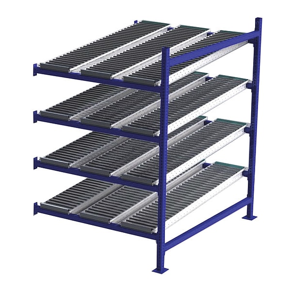 Gravity Flow Rack, 1,000 lb Load Capacity per Shelf, Tilted Shelf Angle, 14 ga Shelf Gauge, Add-On Shelving Configuration, Number of Shelves 4, Decking Finish Powder Coated, Decking Material Steel, Roller Track Decking Style, Depth per Side 60 in, Powder Coated, Steel, Blue, Overall Depth 60 in, Overall Height 72 in, Overall Width 48 in, 12 ga Post Gauge, 4,000 lb Whole Unit Load Capacity, Assembled Unassembled, Labels, Post Caps, Touch Up Marker, Bolt-Together