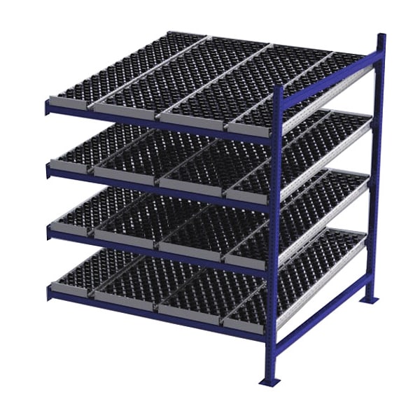 Gravity Flow Rack, 1,000 lb Load Capacity per Shelf, Tilted Shelf Angle, 14 ga Shelf Gauge, Add-On Shelving Configuration, Number of Shelves 4, Decking Finish Powder Coated, Decking Material Rubber, Skate Wheel Track Decking Style, Depth per Side 60 in, Powder Coated, Steel, Blue, Overall Depth 60 in, Overall Height 72 in, Overall Width 60 in, 12 ga Post Gauge, 4,000 lb Whole Unit Load Capacity, Assembled Unassembled, Labels, Post Caps, Touch Up Marker, Bolt-Together