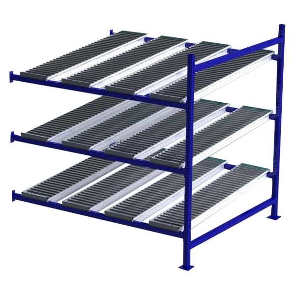 Gravity Flow Rack, 1,000 lb Load Capacity per Shelf, Tilted Shelf Angle, 14 ga Shelf Gauge, Add-On Shelving Configuration, Number of Shelves 3, Decking Finish Powder Coated, Decking Material Steel, Roller Track Decking Style, Depth per Side 60 in, Powder Coated, Steel, Blue, Overall Depth 60 in, Overall Height 72 in, Overall Width 72 in, 12 ga Post Gauge, 3,000 lb Whole Unit Load Capacity, Assembled Unassembled, Labels, Post Caps, Touch Up Marker, Bolt-Together