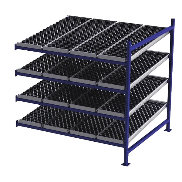 Gravity Flow Rack, 1,000 lb Load Capacity per Shelf, Tilted Shelf Angle, 14 ga Shelf Gauge, Add-On Shelving Configuration, Number of Shelves 4, Decking Finish Powder Coated, Decking Material Rubber, Skate Wheel Track Decking Style, Depth per Side 60 in, Powder Coated, Steel, Blue, Overall Depth 60 in, Overall Height 72 in, Overall Width 72 in, 12 ga Post Gauge, 4,000 lb Whole Unit Load Capacity, Assembled Unassembled, Labels, Post Caps, Touch Up Marker, Bolt-Together