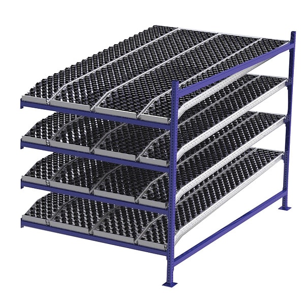 Gravity Flow Rack, 1,000 lb Load Capacity per Shelf, Tilted Shelf Angle, 14 ga Shelf Gauge, Add-On Shelving Configuration, Number of Shelves 4, Decking Finish Powder Coated, Decking Material Rubber, Skate Wheel Track Decking Style, Depth per Side 96 in, Powder Coated, Steel, Blue, Overall Depth 96 in, Overall Height 72 in, Overall Width 60 in, 12 ga Post Gauge, 4,000 lb Whole Unit Load Capacity, Assembled Unassembled, Labels, Post Caps, Touch Up Marker, Bolt-Together
