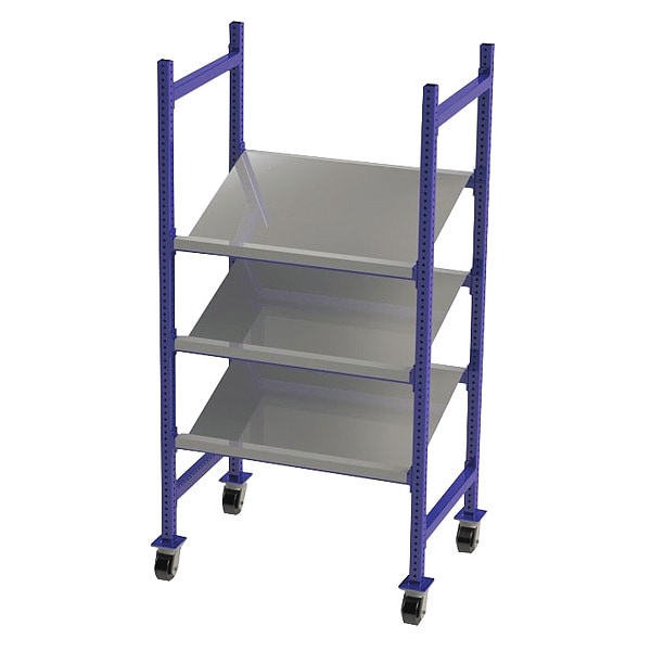 Mobile Gravity Flow Rack, 28 in D, 36 in W, 3 Shelves, Blue