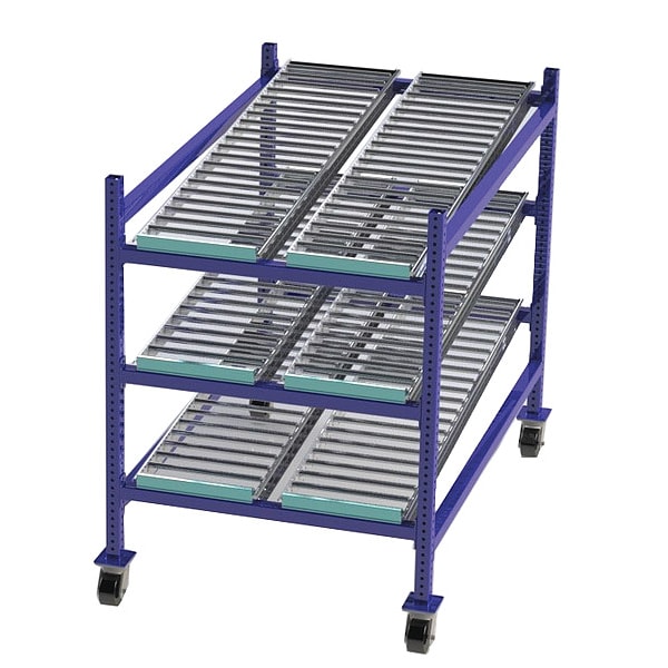 Mobile Gravity Flow Rack, 60 in D, 36 in W, 3 Shelves, Blue
