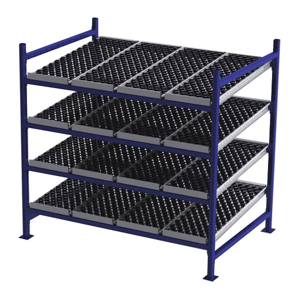 Gravity Flow Rack, 1,000 lb Load Capacity per Shelf, Tilted Shelf Angle, 14 ga Shelf Gauge, Starter Shelving Configuration, Number of Shelves 4, Decking Finish Powder Coated, Decking Material Rubber, Skate Wheel Track Decking Style, Depth per Side 84 in, Powder Coated, Steel, Blue, Overall Depth 48 in, Overall Height 72 in, Overall Width 72 in, 12 ga Post Gauge, 4,000 lb Whole Unit Load Capacity, Assembled Unassembled, Labels, Post Caps, Touch Up Marker, Bolt-Together