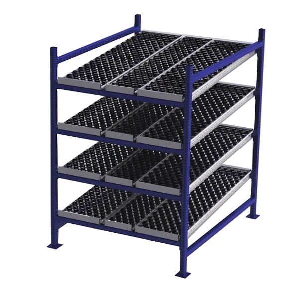 Gravity Flow Rack, 1,000 lb Load Capacity per Shelf, Tilted Shelf Angle, 14 ga Shelf Gauge, Starter Shelving Configuration, Number of Shelves 4, Decking Finish Powder Coated, Decking Material Rubber, Skate Wheel Track Decking Style, Depth per Side 60 in, Powder Coated, Steel, Blue, Overall Depth 60 in, Overall Height 72 in, Overall Width 48 in, 12 ga Post Gauge, 4,000 lb Whole Unit Load Capacity, Assembled Unassembled, Labels, Post Caps, Touch Up Marker, Bolt-Together