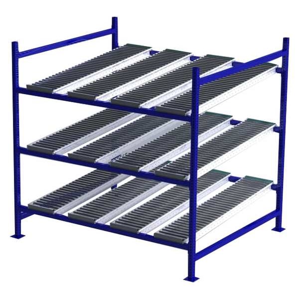 Gravity Flow Rack, 1,000 lb Load Capacity per Shelf, Tilted Shelf Angle, 14 ga Shelf Gauge, Starter Shelving Configuration, Number of Shelves 3, Decking Finish Powder Coated, Decking Material Steel, Roller Track Decking Style, Depth per Side 60 in, Powder Coated, Steel, Blue, Overall Depth 60 in, Overall Height 72 in, Overall Width 72 in, 12 ga Post Gauge, 3,000 lb Whole Unit Load Capacity, Assembled Unassembled, Labels, Post Caps, Touch Up Marker, Bolt-Together