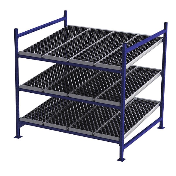 Gravity Flow Rack, 1,000 lb Load Capacity per Shelf, Tilted Shelf Angle, 14 ga Shelf Gauge, Starter Shelving Configuration, Number of Shelves 3, Decking Finish Powder Coated, Decking Material Rubber, Skate Wheel Track Decking Style, Depth per Side 60 in, Powder Coated, Steel, Blue, Overall Depth 60 in, Overall Height 72 in, Overall Width 72 in, 12 ga Post Gauge, 3,000 lb Whole Unit Load Capacity, Assembled Unassembled, Labels, Post Caps, Touch Up Marker, Bolt-Together