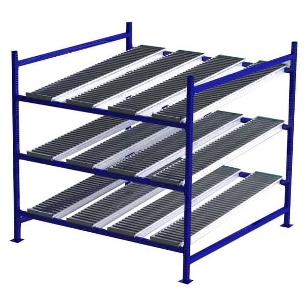 Gravity Flow Rack, 1,000 lb Load Capacity per Shelf, Tilted Shelf Angle, 14 ga Shelf Gauge, Starter Shelving Configuration, Number of Shelves 3, Decking Finish Powder Coated, Decking Material Steel, Roller Track Decking Style, Depth per Side 72 in, Powder Coated, Steel, Blue, Overall Depth 72 in, Overall Height 72 in, Overall Width 72 in, 12 ga Post Gauge, 3,000 lb Whole Unit Load Capacity, Assembled Unassembled, Labels, Post Caps, Touch Up Marker, Bolt-Together