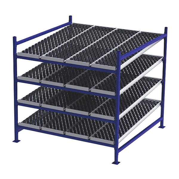 Gravity Flow Rack, 1,000 lb Load Capacity per Shelf, Tilted Shelf Angle, 14 ga Shelf Gauge, Starter Shelving Configuration, Number of Shelves 4, Decking Finish Powder Coated, Decking Material Rubber, Skate Wheel Track Decking Style, Depth per Side 72 in, Powder Coated, Steel, Blue, Overall Depth 72 in, Overall Height 72 in, Overall Width 72 in, 12 ga Post Gauge, 4,000 lb Whole Unit Load Capacity, Assembled Unassembled, Labels, Post Caps, Touch Up Marker, Bolt-Together