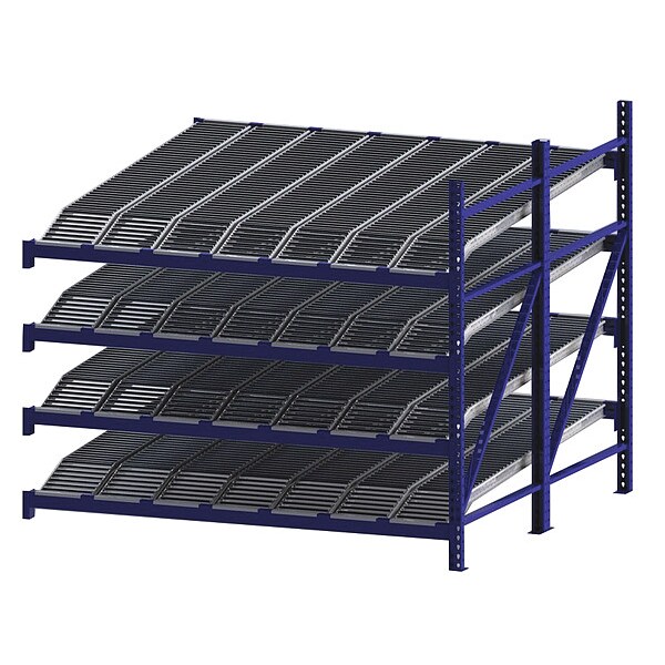 Gravity Flow Rack, 3,000 lb Load Capacity per Shelf, Tilted Shelf Angle, 14 ga Shelf Gauge, Add-On Shelving Configuration, Number of Shelves 4, Decking Finish Powder Coated, Decking Material Steel, Roller Track Decking Style, Depth per Side 96 in, Powder Coated, Steel, Blue, Overall Depth 96 in, Overall Height 84 in, Overall Width 96 in, 12 ga Post Gauge, 12,000 lb Whole Unit Load Capacity, Assembled Unassembled, Labels, Post Caps, Touch Up Marker, Boltless