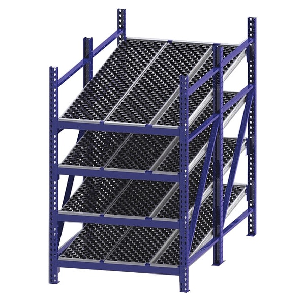 Gravity Flow Rack, 3,000 lb Load Capacity per Shelf, Tilted Shelf Angle, 14 ga Shelf Gauge, Starter Shelving Configuration, Number of Shelves 4, Decking Finish Powder Coated, Decking Material Rubber, Skate Wheel Track Decking Style, Depth per Side 96 in, Powder Coated, Steel, Blue, Overall Depth 96 in, Overall Height 84 in, Overall Width 48 in, 12 ga Post Gauge, 12,000 lb Whole Unit Load Capacity, Assembled Unassembled, Labels, Post Caps, Touch Up Marker, Boltless