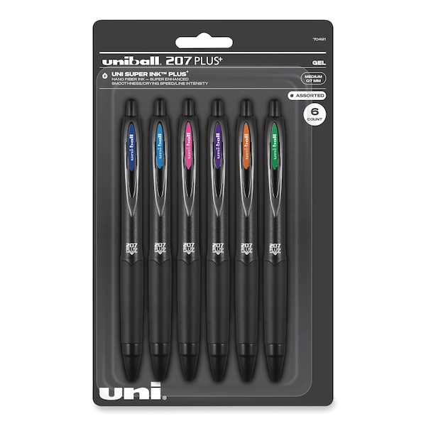 Gel Pen 207 Plus+, Retractable, Medium 0.7 mm, Inspirational Ink-Color Assortment, Black Barrel, 6PK