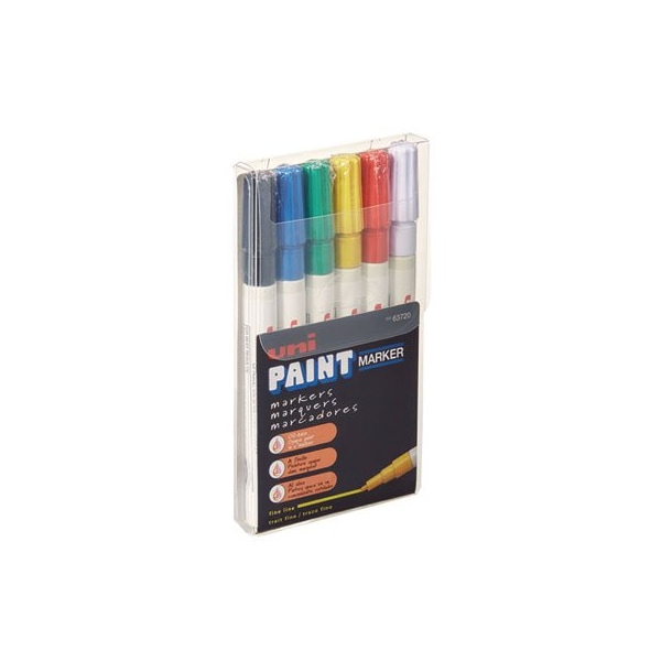 Create permanent and accurate marks on virtually any surface with uni Paint oil-based paint markers from uni-ball. These markers deliver strong and clearly visible lines. Quick-drying paint is water, fade, heat and abrasion resistant. Valve action control provides excellent flow and coverage, while also preventing the marker from drying out if left uncapped. Permanent paint colors mark opaque and glossy on both light and dark surfaces, no matter what it is applied to. The metal barrel and durable tip ensures a long marking life. Ideal for manufacturing, construction sites, automotive, metal fabrication, aviation, marking oily, greasy items and identifying parts or equipment outside. Marker Ink Type: Permanent; Marker Tip Type: Bullet; Marker Tip Size text: Fine; Marker Colors: Assorted.