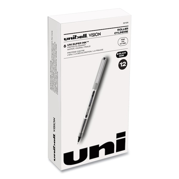 uni-ball® VISION Stick Roller Ball Pen, Fine 0.7mm, Black Ink, Black/Gray Barrel, Dozen