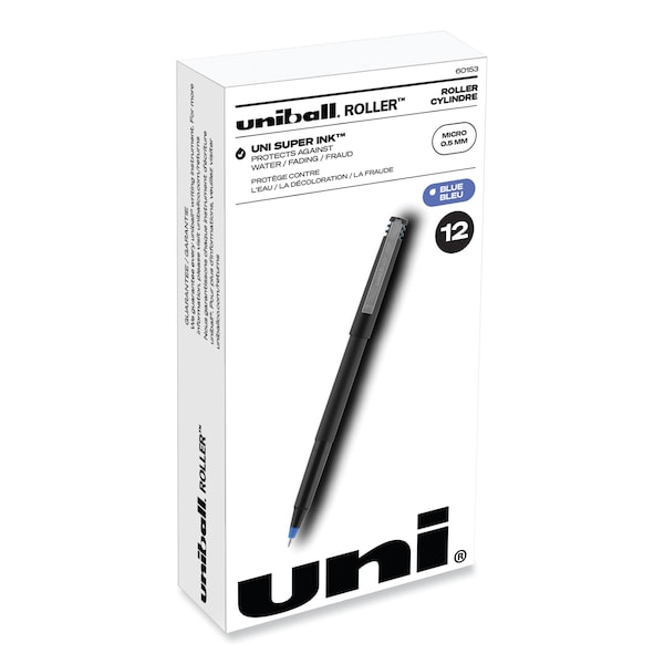 Stick Roller Ball Pen, Micro 0.5mm, Blue Ink, Black Matte Barrel, PK12 (Discontinued)