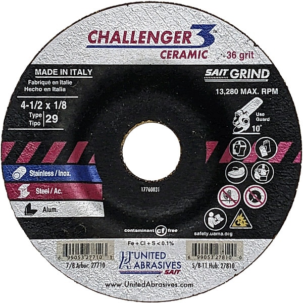 Abrasive Grinding Wheel, Abrasive Material Ceramic, Connector Size 7/8 in, Connector Type Unthreaded Hole, Grit 36, Overall Diameter 4 1/2 in, Overall Thickness 0.125 in, Primary Material Application Aluminum, Brass, Copper, Stainless Steel, Steel, Compatible Tool Type Angle Grinder, Series Challenger 3 Ceramic, Wheel Type Type 29