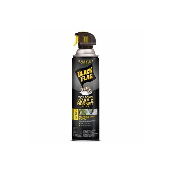 Black Flag 14 oz. Foaming Wasp & Hornet Killer. Non-Staining will have no oily residue. Blanketing foam kills by contact. Up to a 20 ft. jet spray. Controls wasps and hornets: designed to kill wasps hornets mud daubers yellow jackets and others. 0.02% Prallethrin 0.04% Lambda Cyhalothrin.