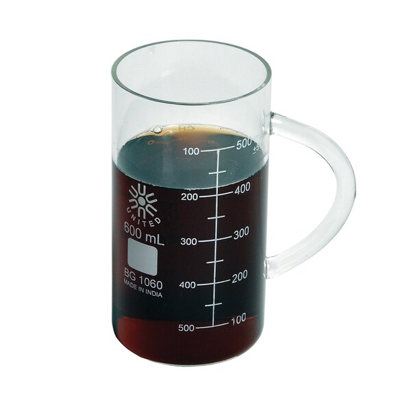 Crafted from high-quality borosilicate glass, this beaker-shaped mug features enameled graduations on one side and the molecular structure of caffeine on the other. Designed with durable handle and smooth rim. Capacity is 600ml.