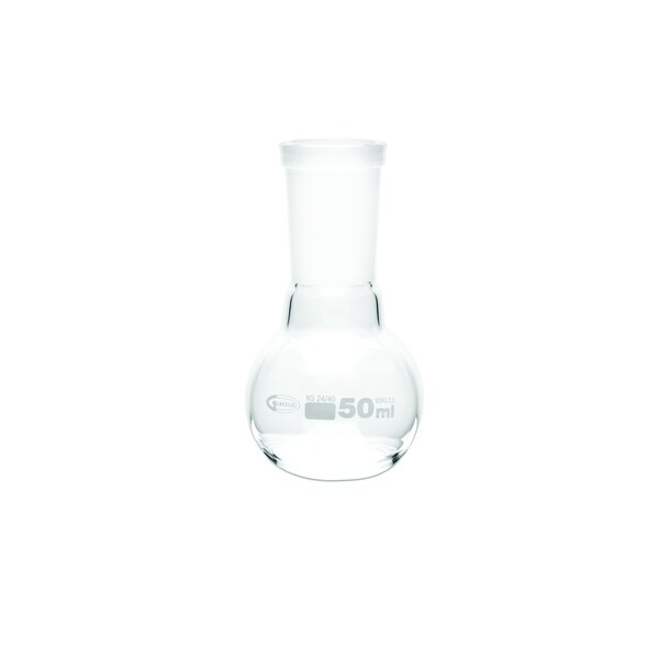 Pack of six flat-bottom boiling flasks with 50ml capacity and ground glass joints (24/40). Made from low-expansion borosilicate glass, these flasks feature uniform wall thickness for superior mechanical strength and shock resistance.