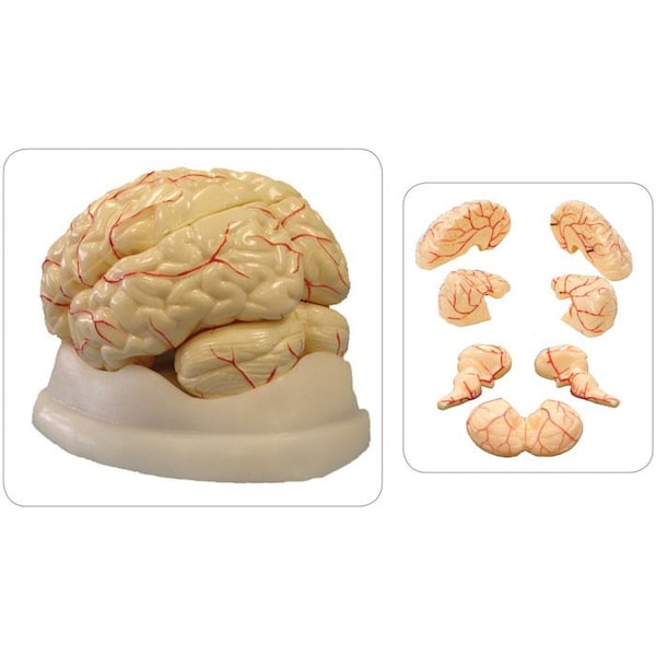 An excellent, life-sized human brain model for students. Dissectible into eight parts: two parts in the brain stem, two parts in the cerebellum, and four parts in the cerebrum. The following features are shown in vibrant colors: brain stem, nerves, blood vessels, parietal lobes, and temporal lobes. A key and a molded plastic base are included.