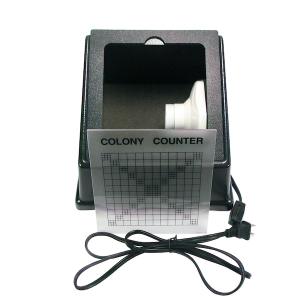 Microorganisms are far too small to count with the naked eye, but they form visible colonies when they join together. When a Petri dish is placed on a lighted base, the grid pattern is illuminated. The 12 by 12 grid contains 1 cm x 1 cm squares. 24 of the squares are broken down into smaller increments of 9 squares, each 1/3 cm in size. To calculate an average colony count per square, the visible colonies are added together and divided by the total number of squares. Since the Petri dish is close to the light source, it is recommended to use an LED bulb to reduce the risk of heat damaging the sample. The apparatus has a standard bulb base. The power cord has an inline on/off switch. Overall dimensions are 9†x 9†x 7â€, 3.1 pounds. Required but not included is a light bulb. Includes activity guide. Colony Counter grid includes 1 cm and 1/3 cm squares. Use of LED bulbs are recommended to protect sensitive samples. Large viewing area. Includes activity guide.